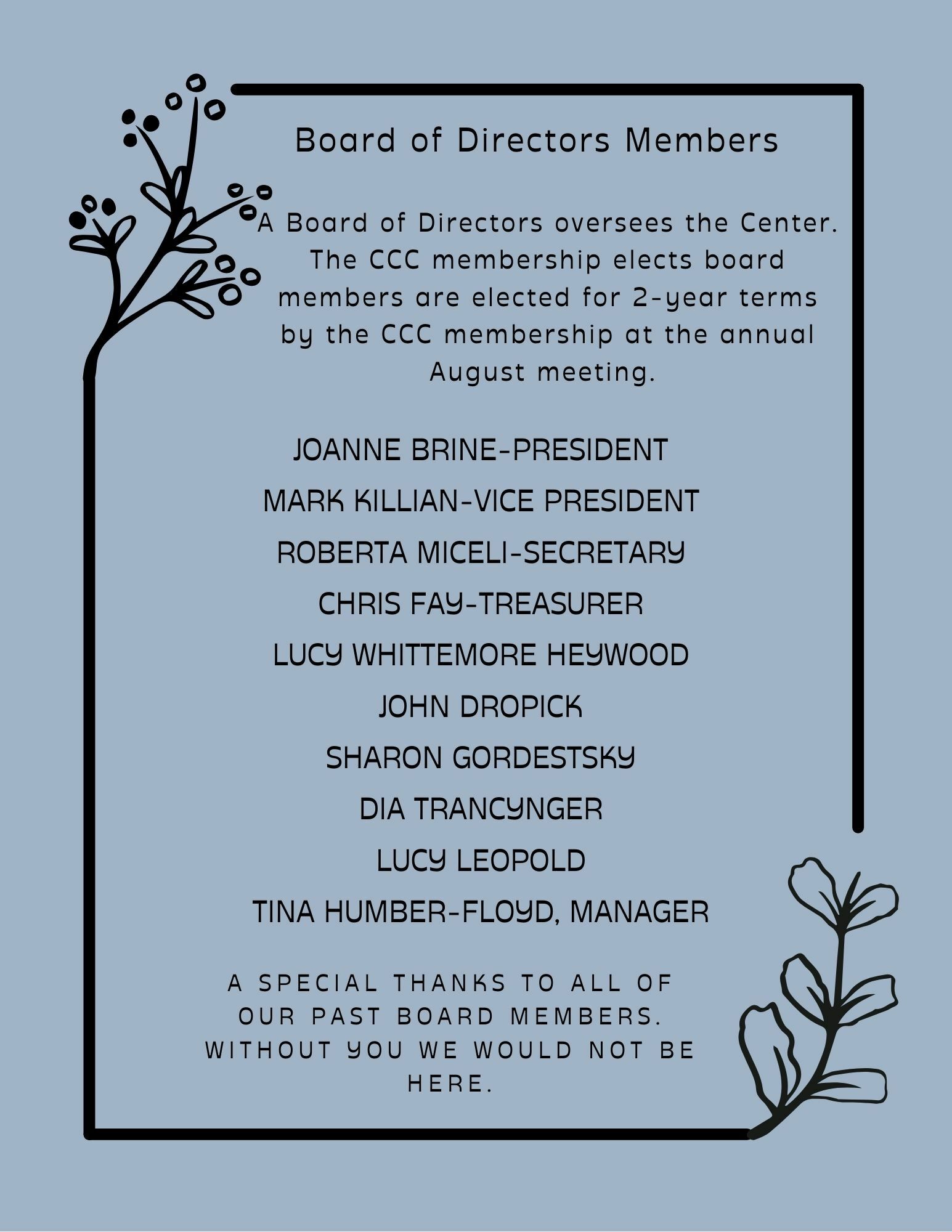 The Chappaquiddick Community Center’s board of directors consists of 5 year-round and four seasonal members. Directors shall serve two-year terms. No director shall hold office for over three consecutive full or partial terms. After a two-year absence, a former director will be eligible for re-election to the board.